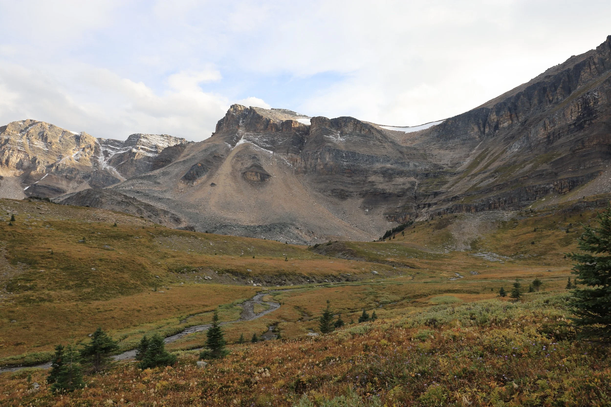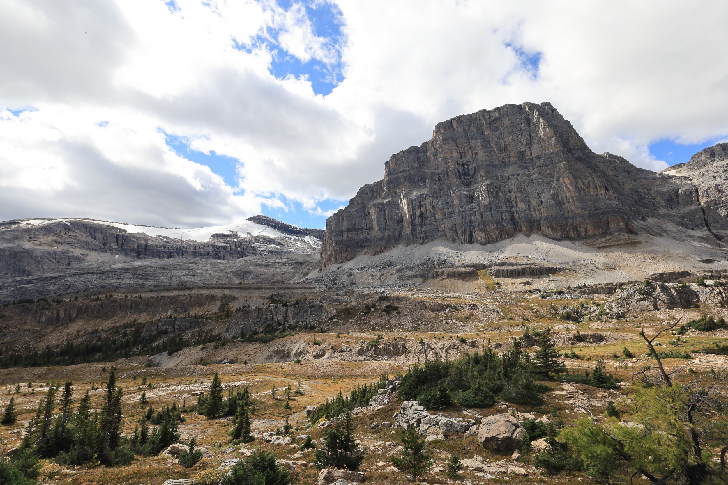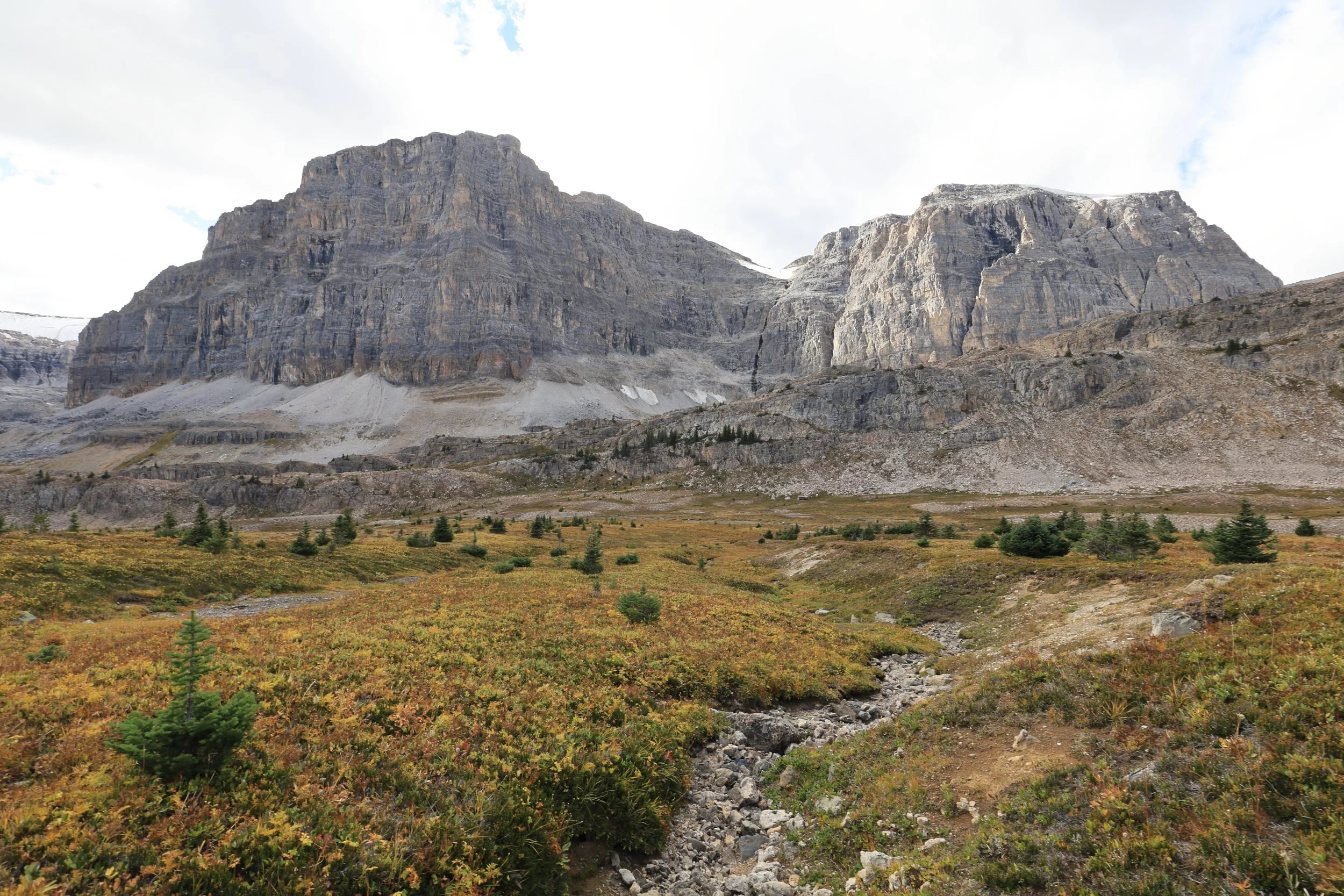 There was a wedge of old winter snow hiding in the dip of the pass. It seemed unlikely to melt as fresh snowfall was already filling cracks between ledges on the shadowy side of this grand rock wall. It also didn’t look like the remnants of an ancient glacier, but I wondered since accumulation outpaced the melting of snow here, would this little patch of hardened ice crystals be classified as a new glacier? Even if just for one year…