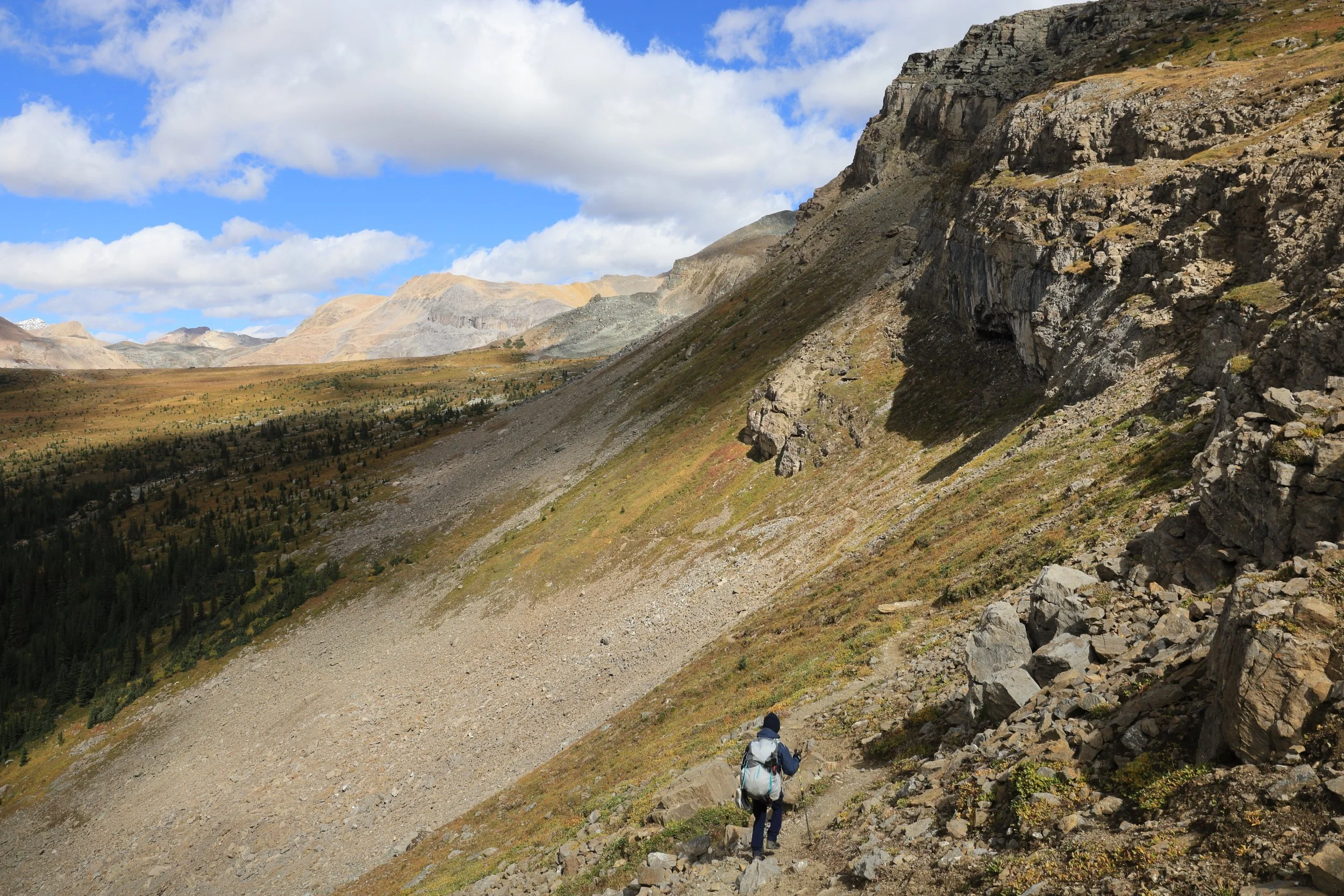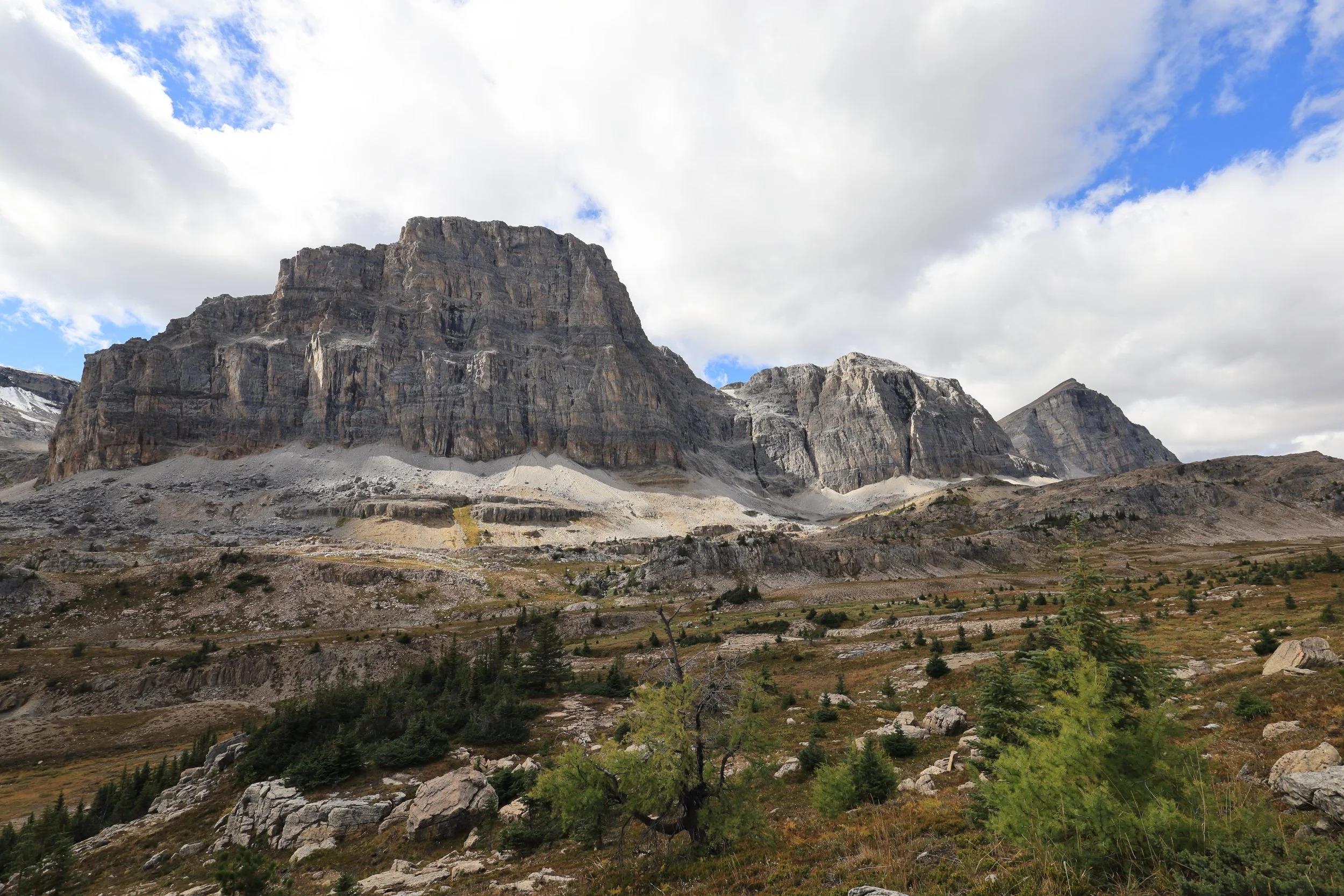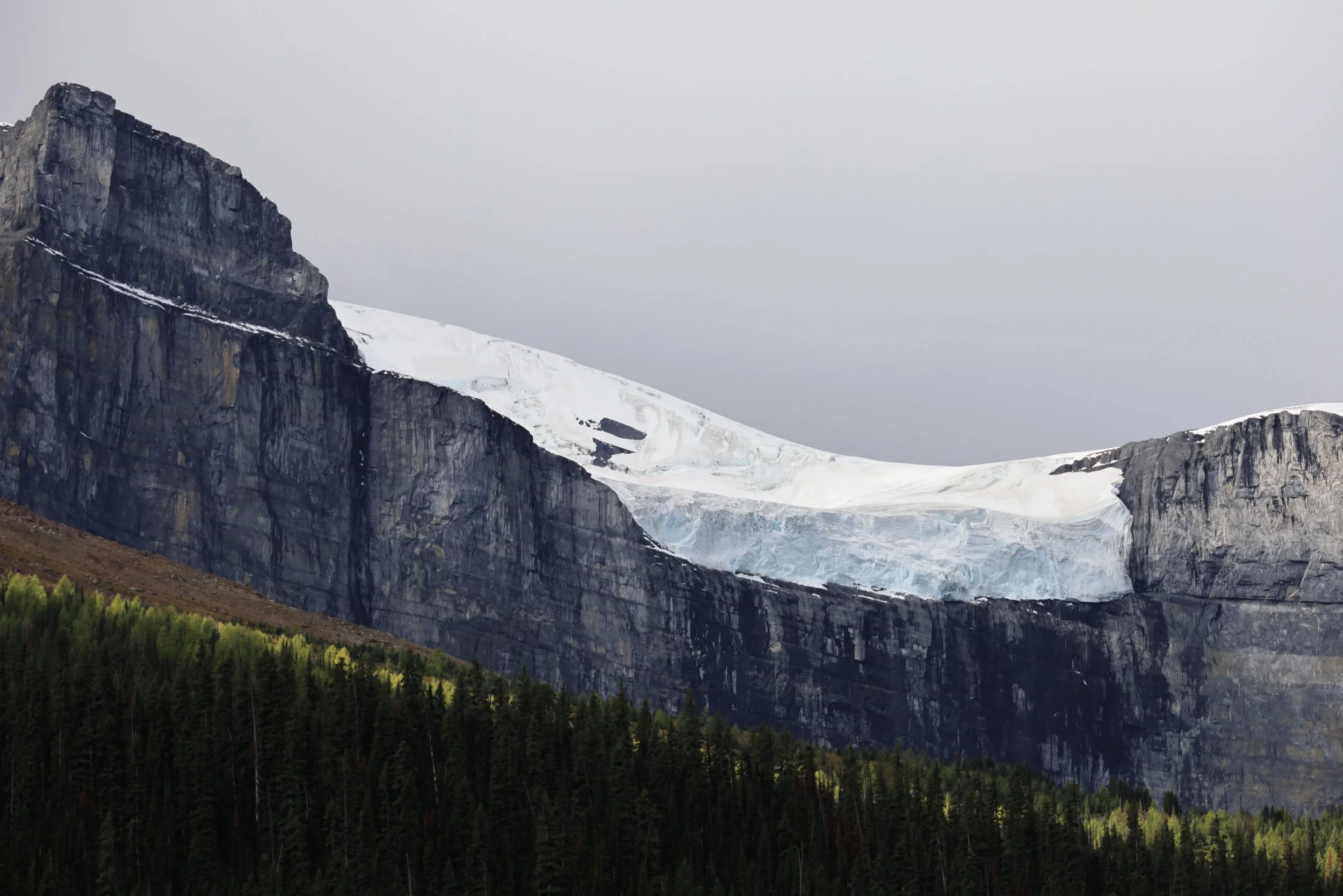 There was a wedge of old winter snow hiding in the dip of the pass. It seemed unlikely to melt as fresh snowfall was already filling cracks between ledges on the shadowy side of this grand rock wall. It also didn’t look like the remnants of an ancient glacier, but I wondered since accumulation outpaced the melting of snow here, would this little patch of hardened ice crystals be classified as a new glacier? Even if just for one year…