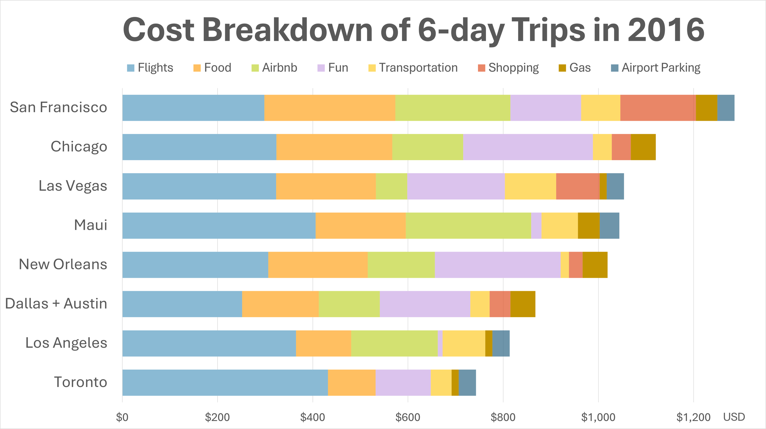 Shorter trips cost more per day than longer ones. This is common sense, but that lesson became clear from my own data on these 6-day trips which showed that flights were always the biggest expense.