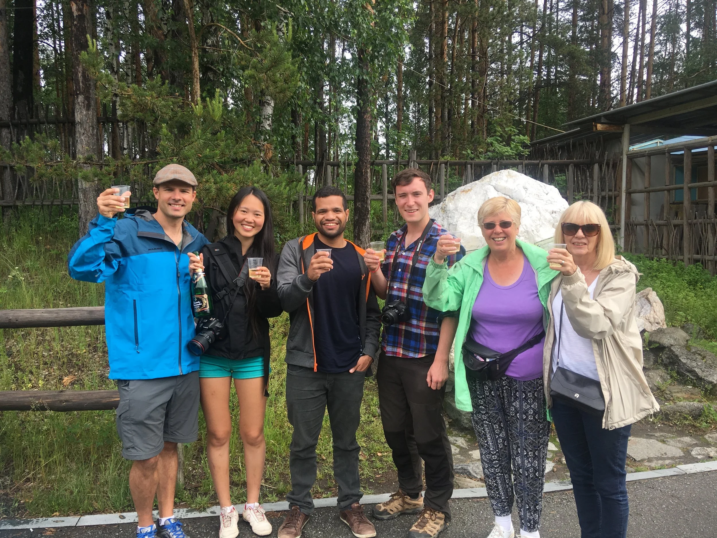 Toasting with champagne at the border between Asia and Europe near Yekaterinburg, Russia. We unexpectedly bumped into fellow travelers from the train we had been chatting with over the past few days.