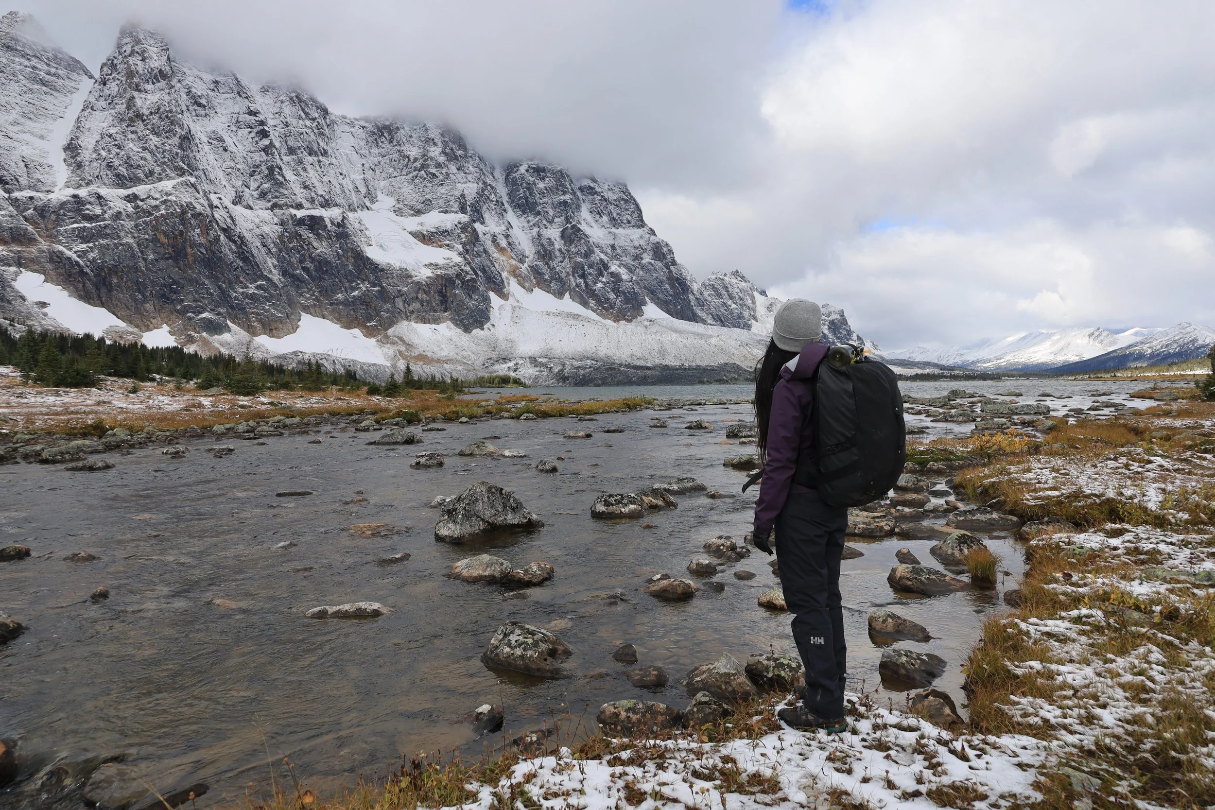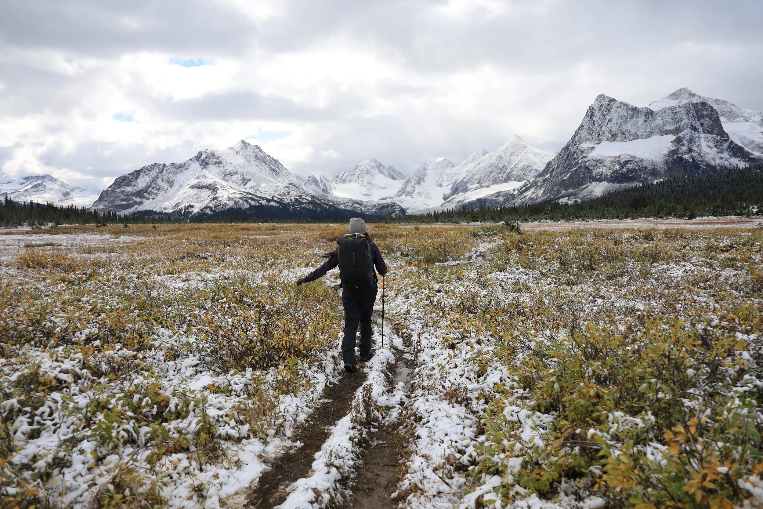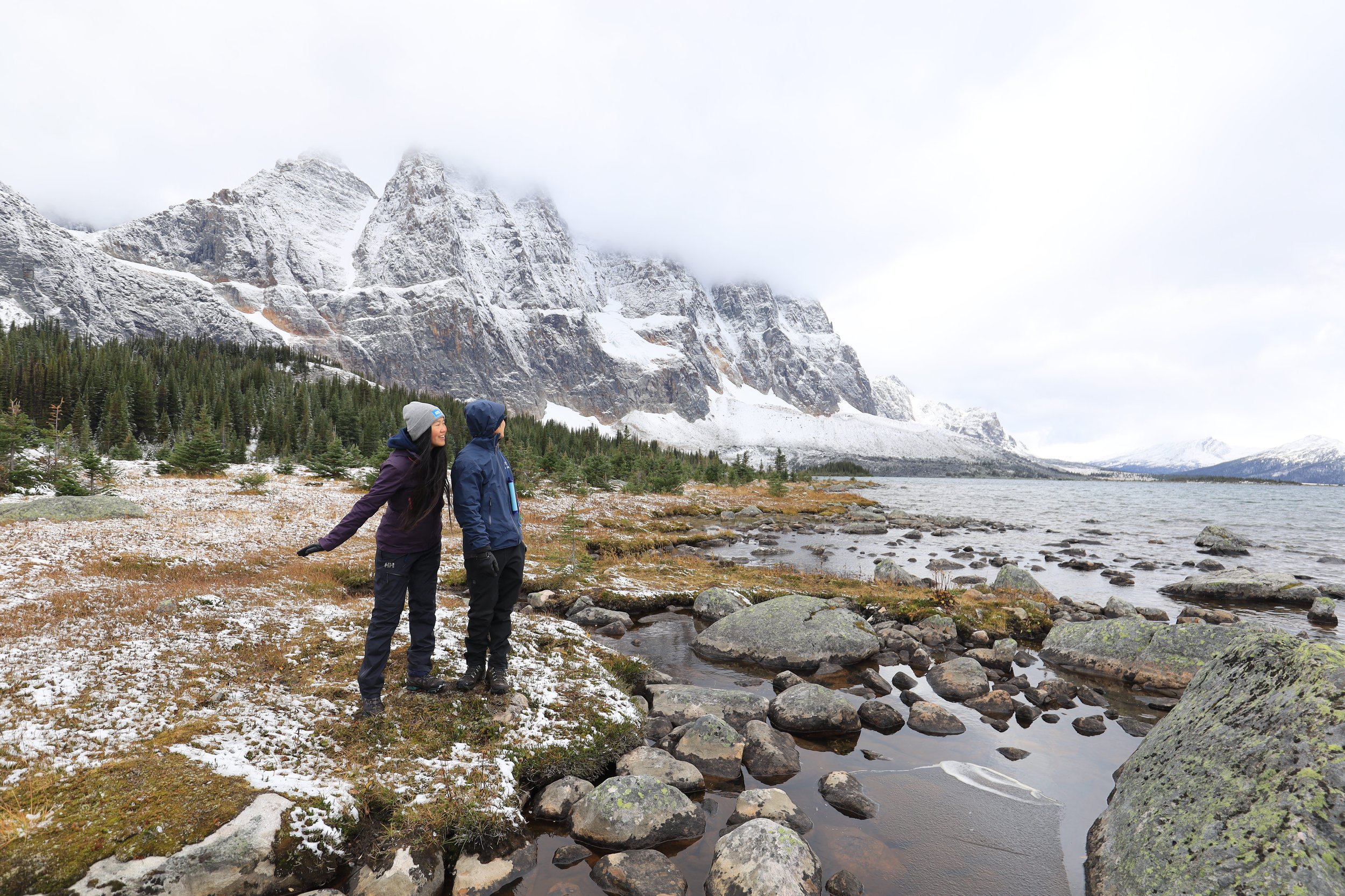 The frosty north wind funneled down Tonquin Valley, licking up waves on the sparse rocky shore of Amethyst Lakes. Today is a flat 5.6km walk from the south end of the lake to the main campground in the middle. We have plenty of time but with no respite from the wind, we agree to get moving after a few minutes of frozen hands and noses.