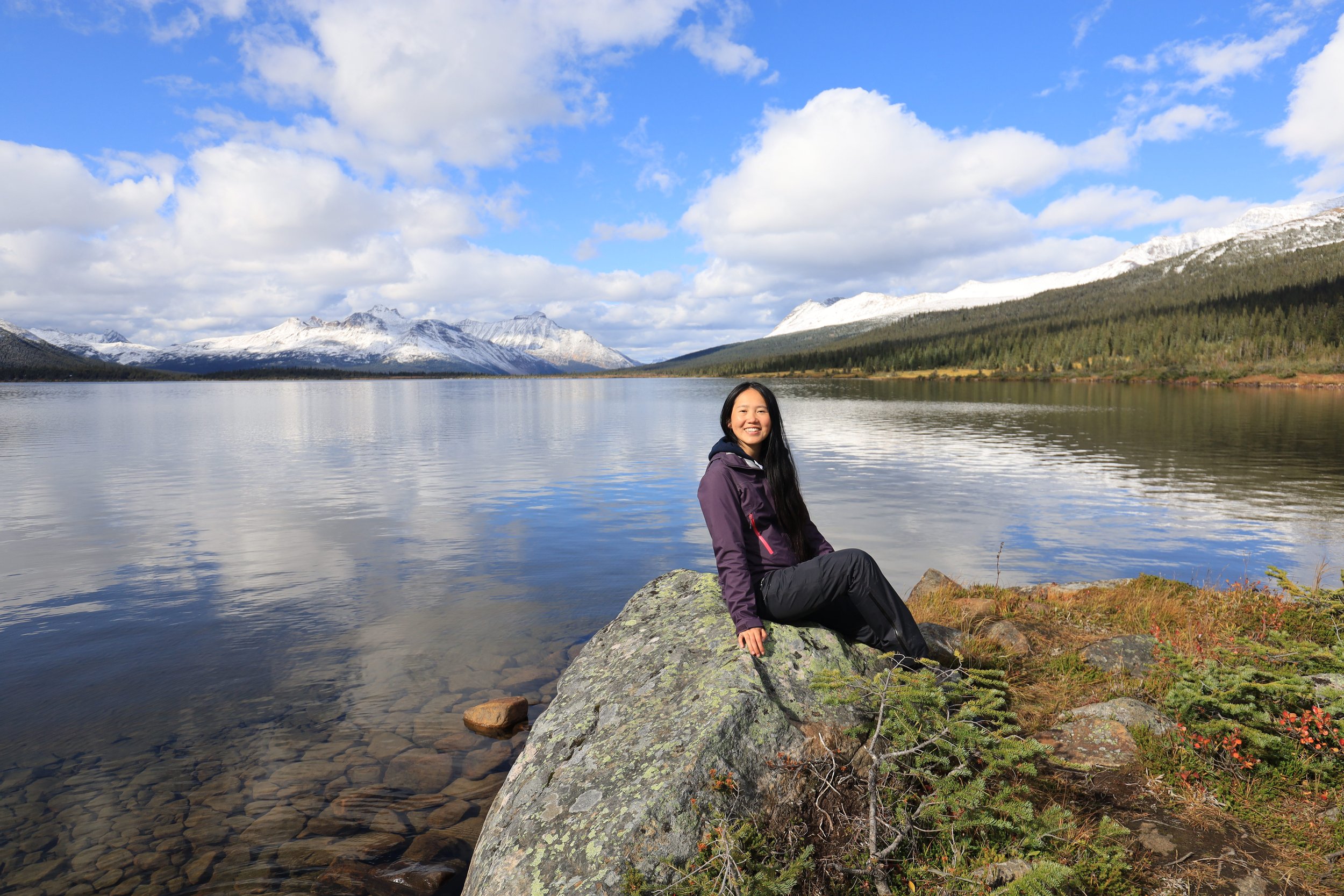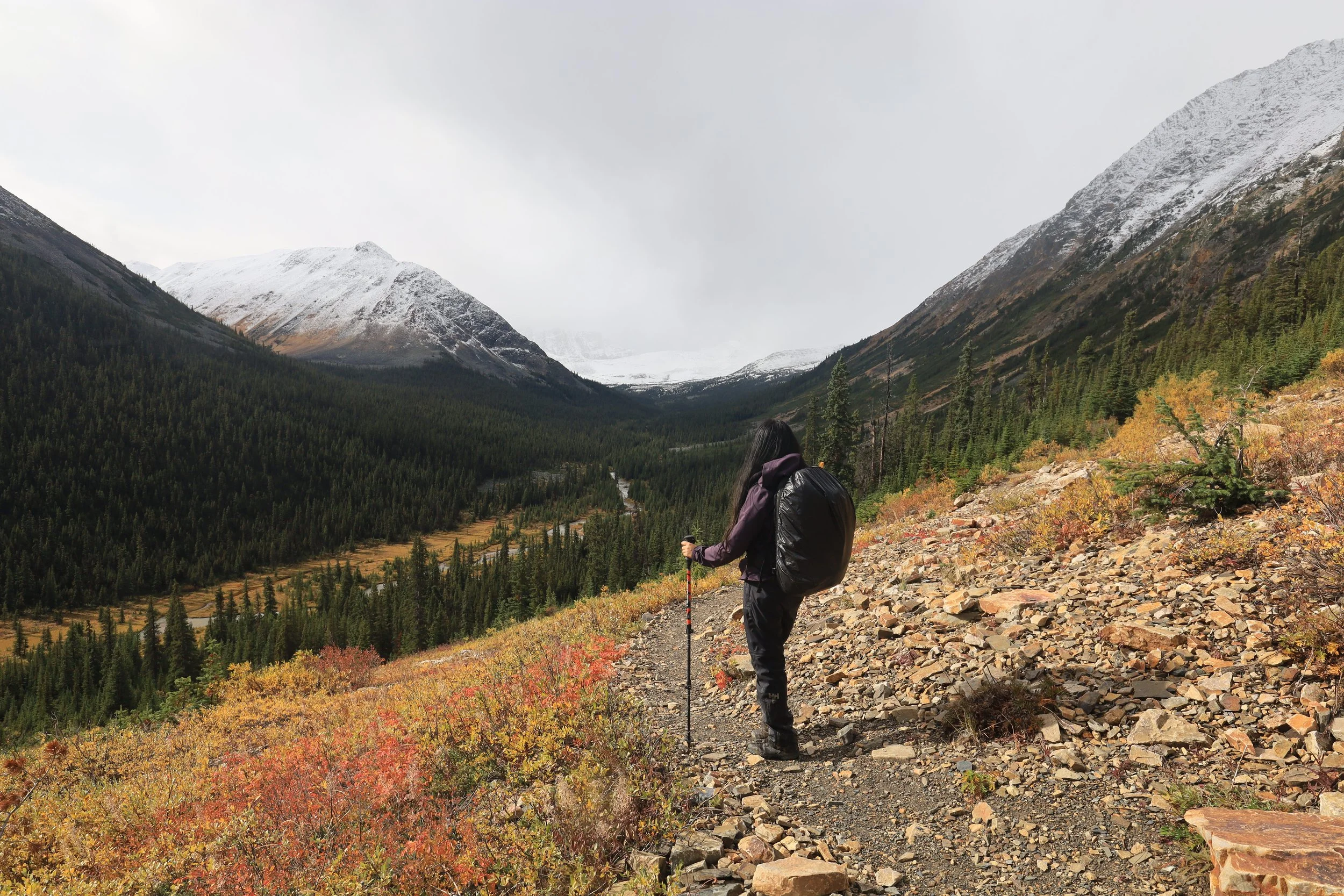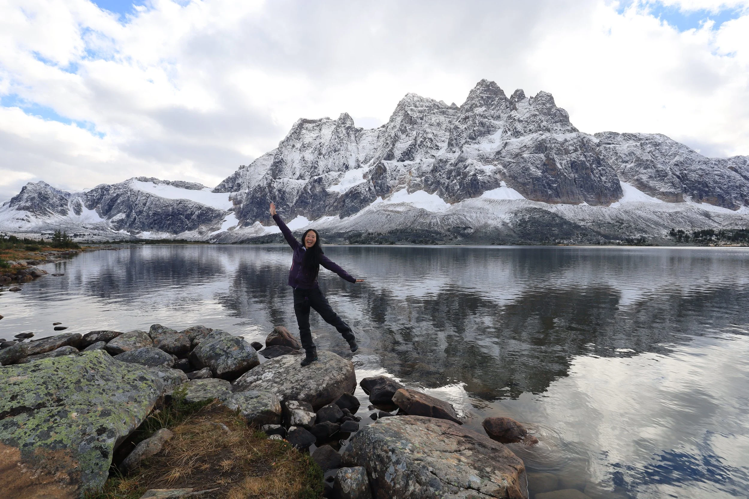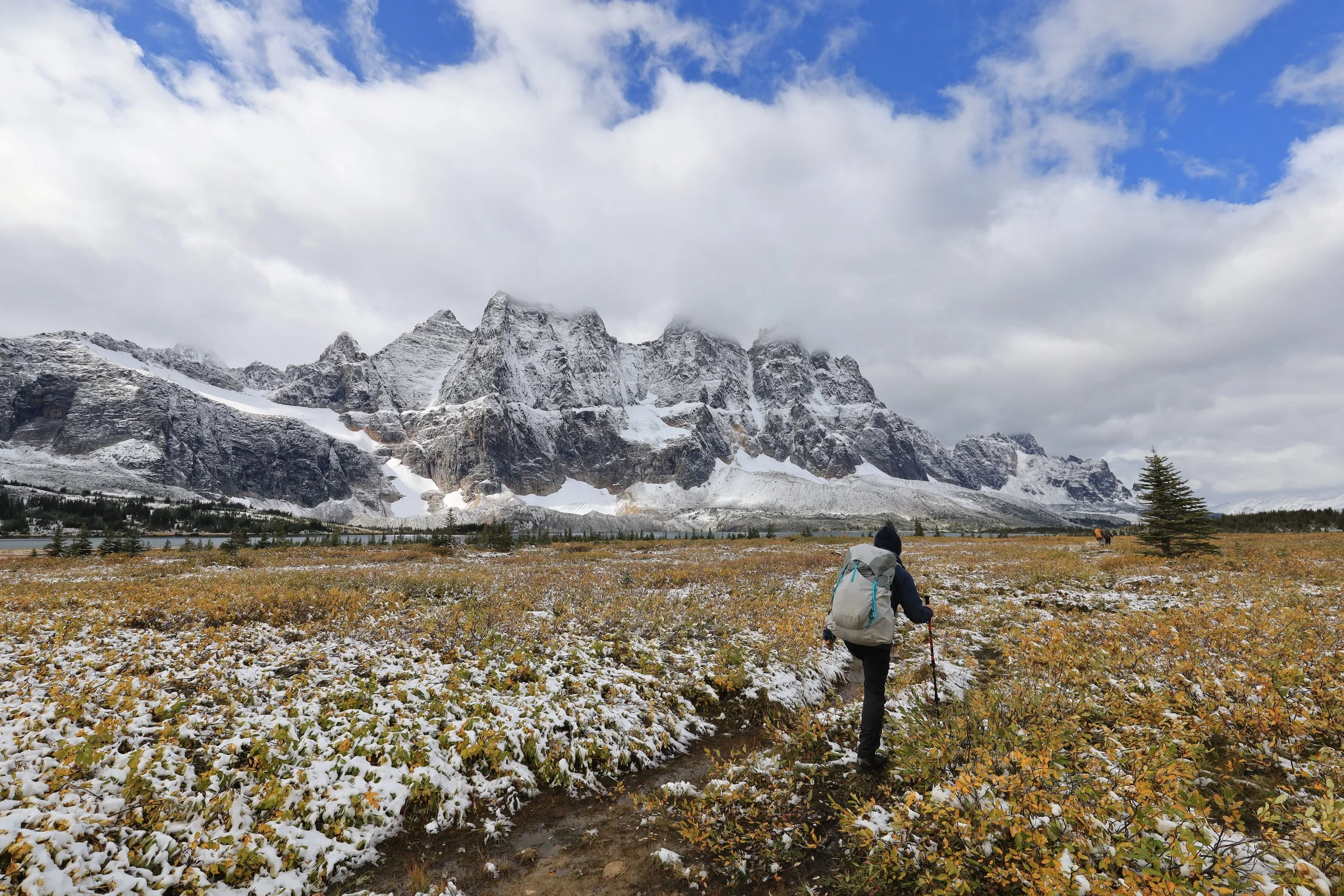 The frosty north wind funneled down Tonquin Valley, licking up waves on the sparse rocky shore of Amethyst Lakes. Today is a flat 5.6km walk from the south end of the lake to the main campground in the middle. We have plenty of time but with no respite from the wind, we agree to get moving after a few minutes of frozen hands and noses.