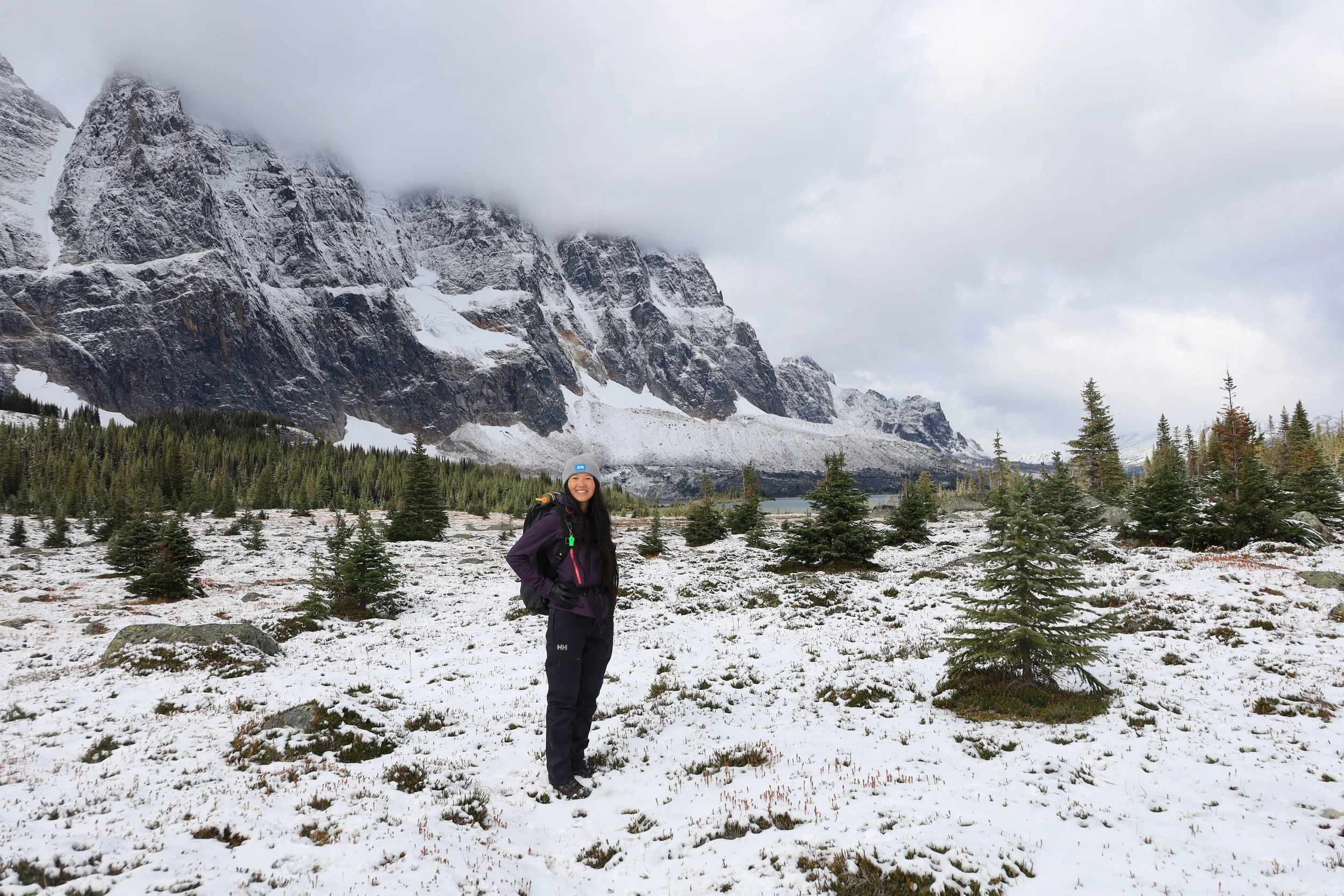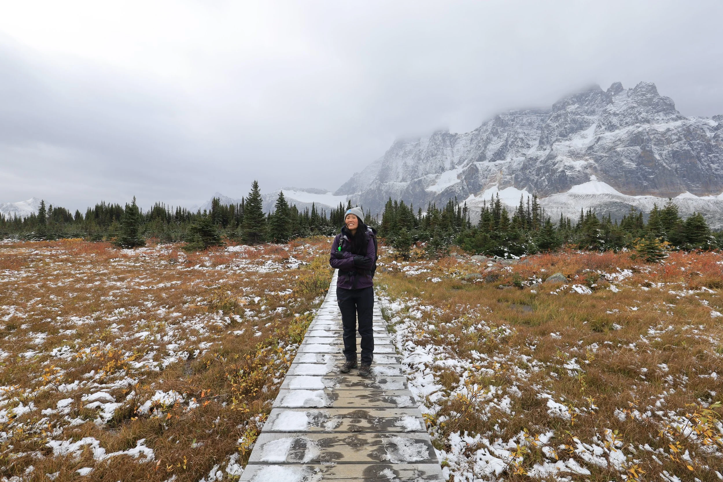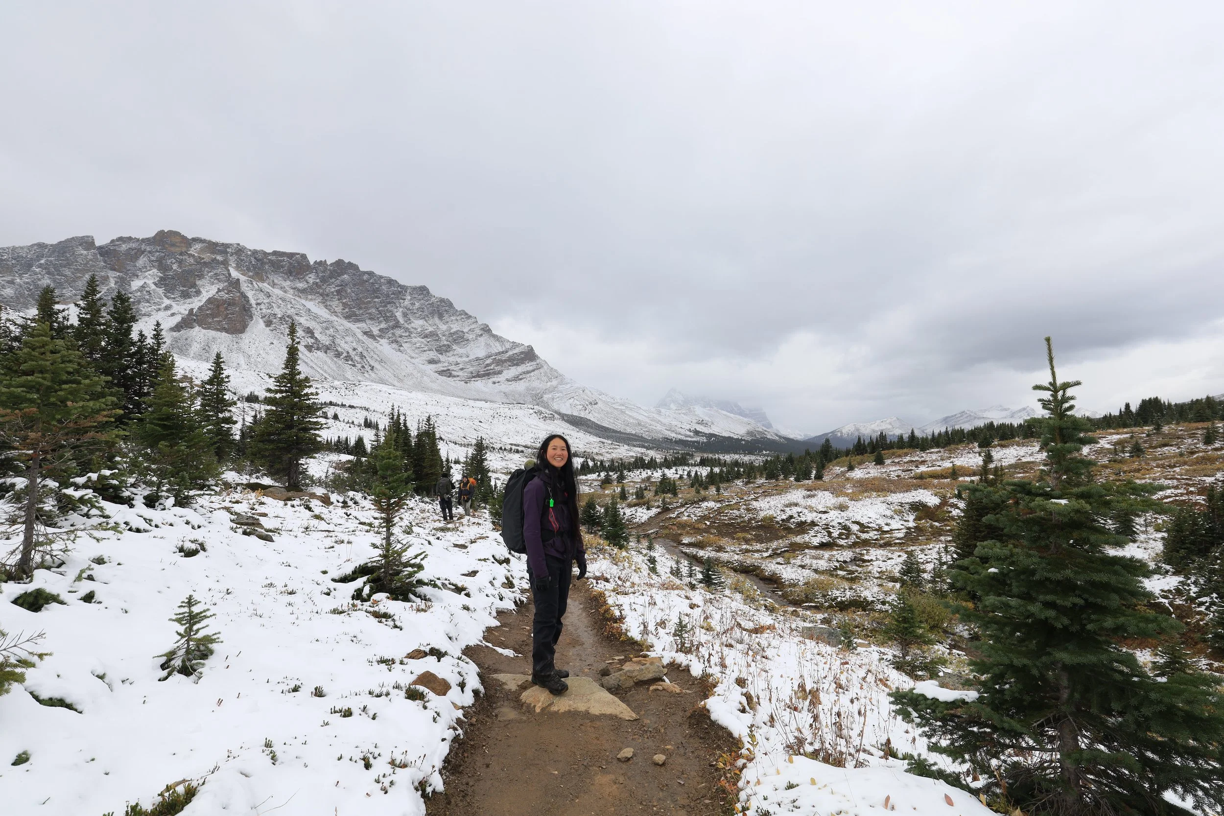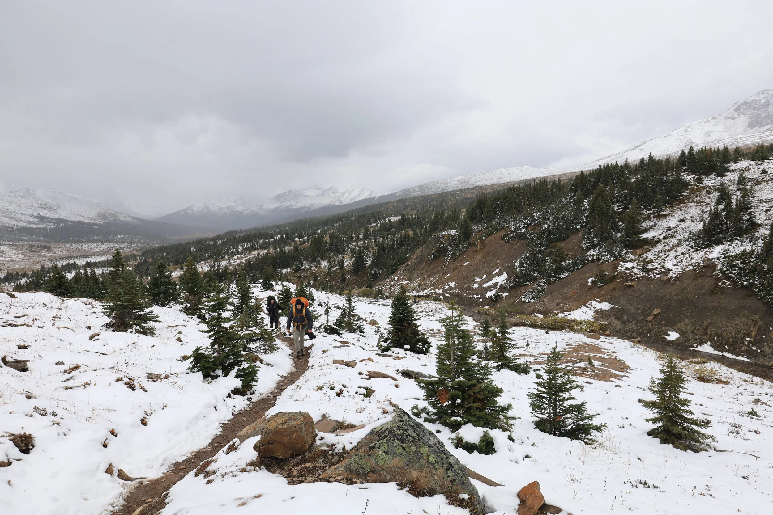 Although it had been snowing this whole time since leaving Maccarib campground, the snowfall gradually picked up the closer we got to Maccarib Pass, the highest point on the Tonquin Valley trail. I clutched my camera against my jacket and tried my best to keep the lens dry.