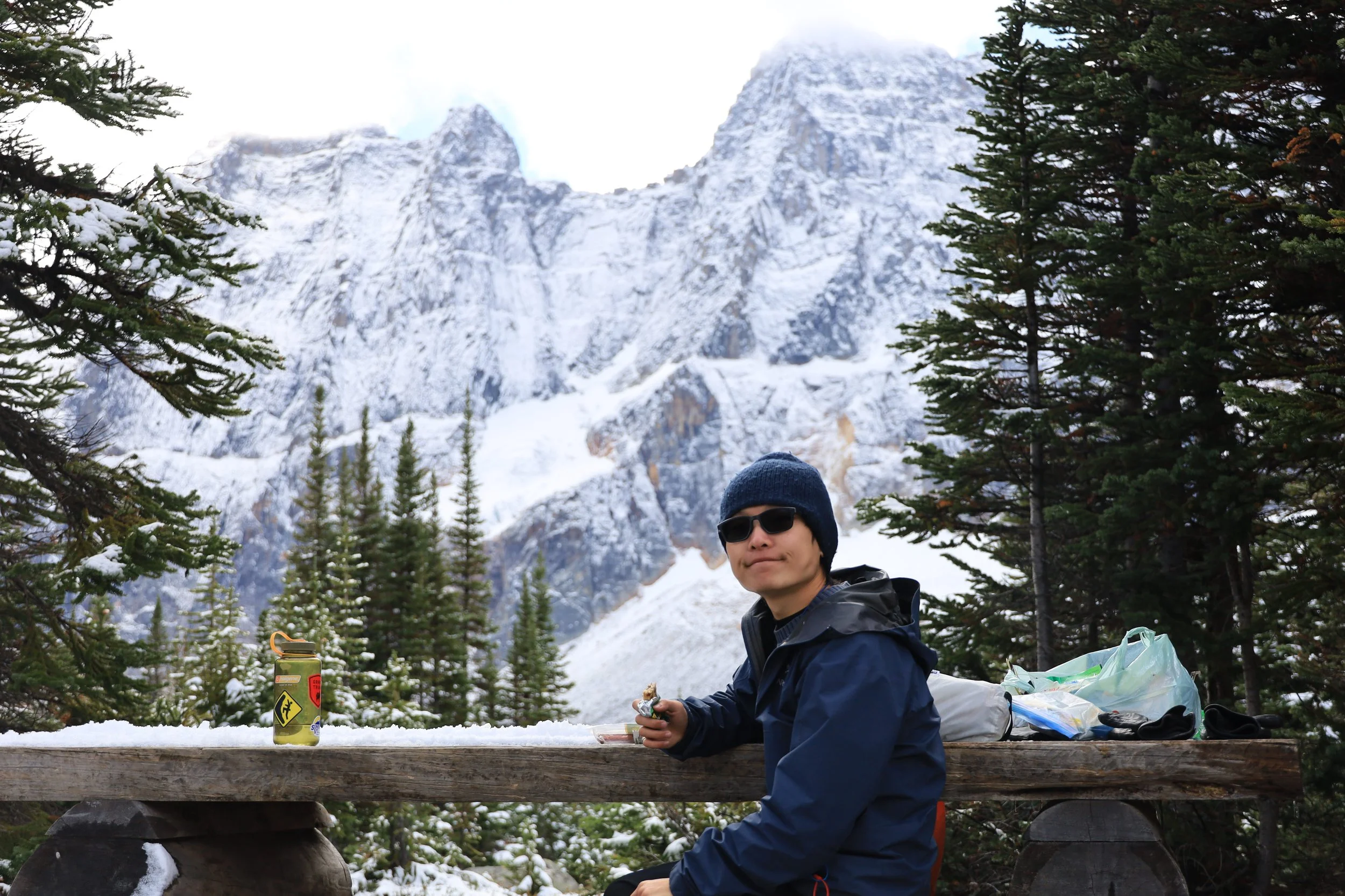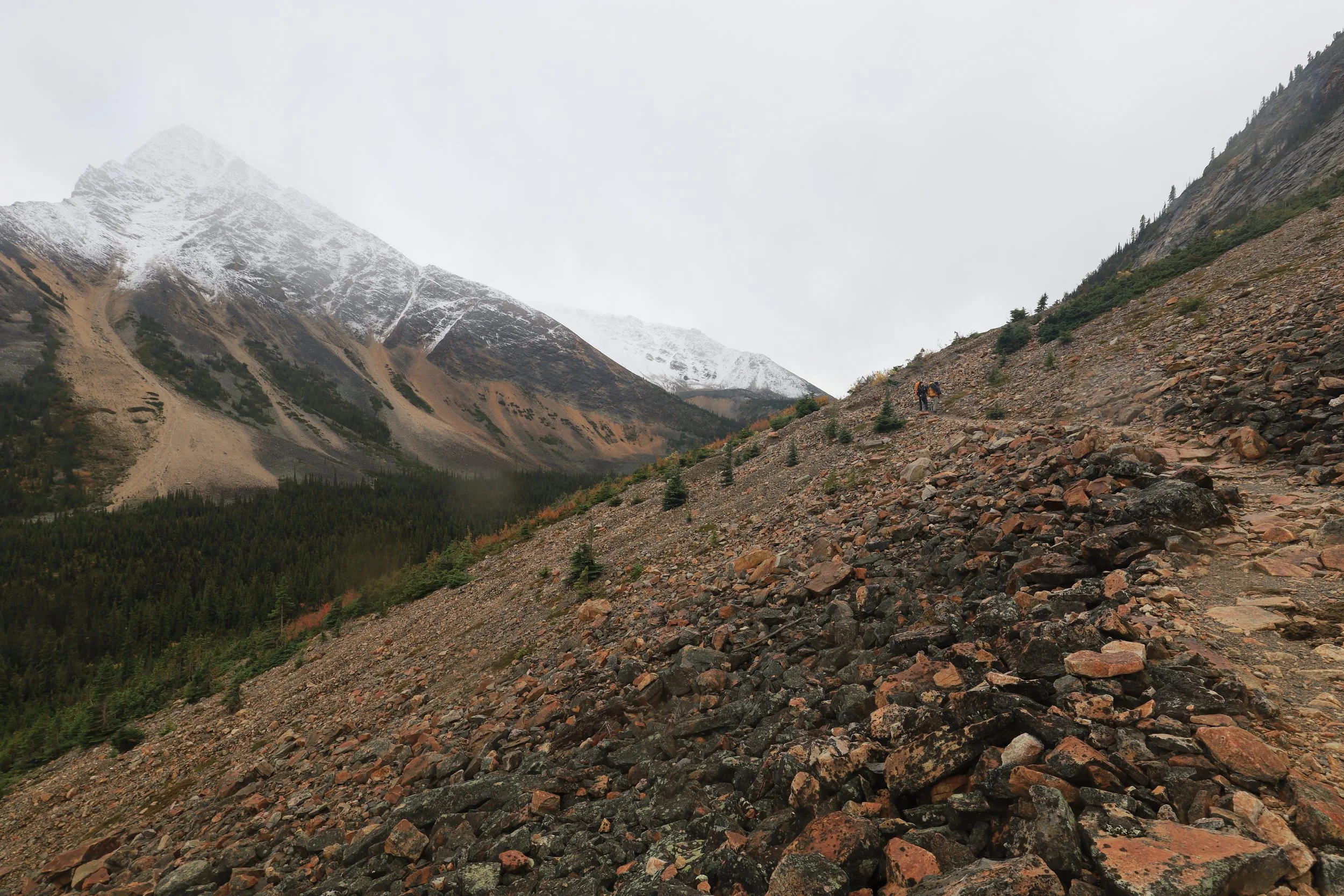 Towards this glacier dripping down the rock wall is the Wates-Gibson hut run by the Alpine Club of Canada. From this junction it was only 1km away, while our campsite was another 1.7km. If I were to do this hike again, I would definitely snag a booking there.