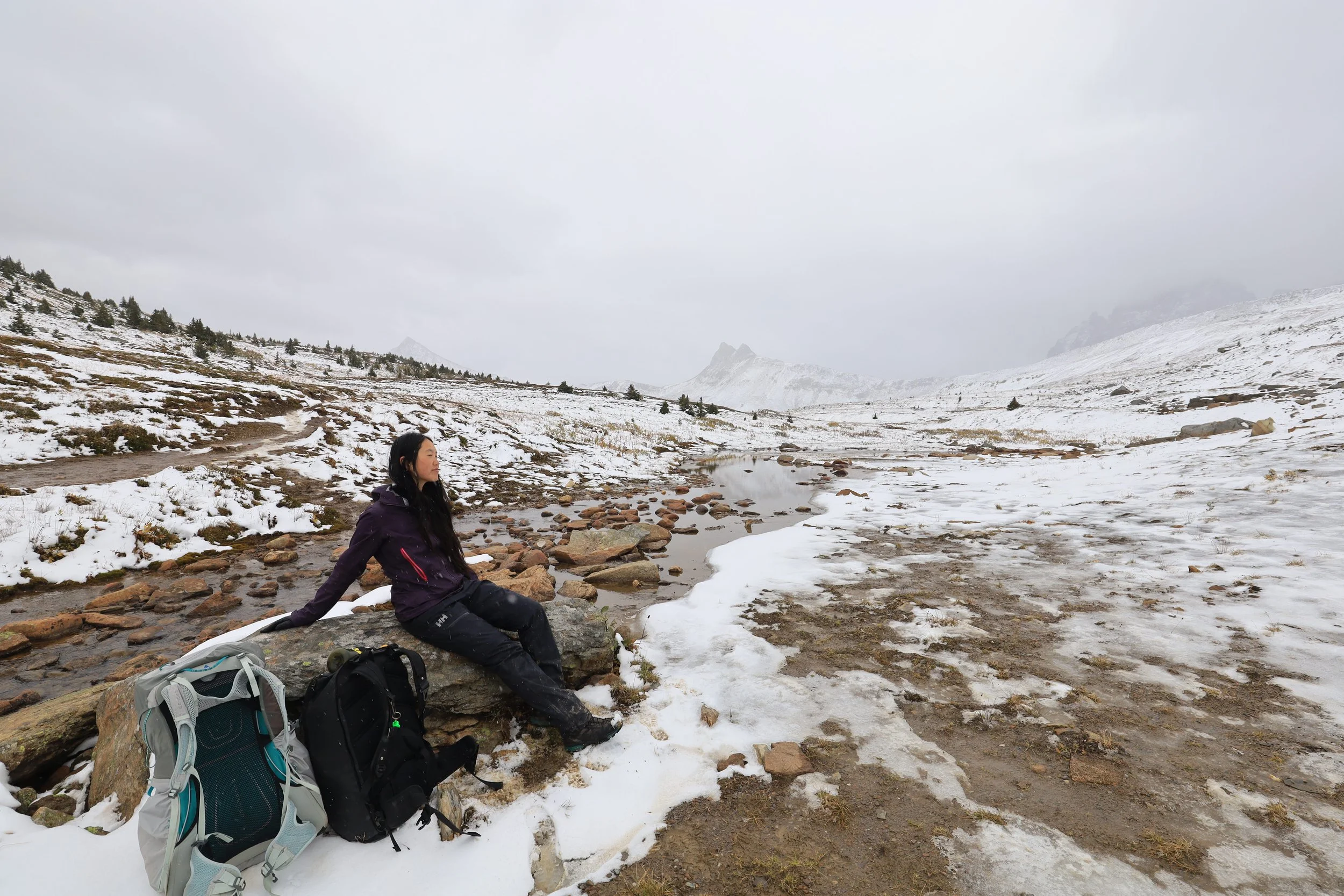 Astoria Campground has a gorgeous view of the valley below. We take a break on the picnic benches and layer up as the overhanging snow finally begins to pummel down.